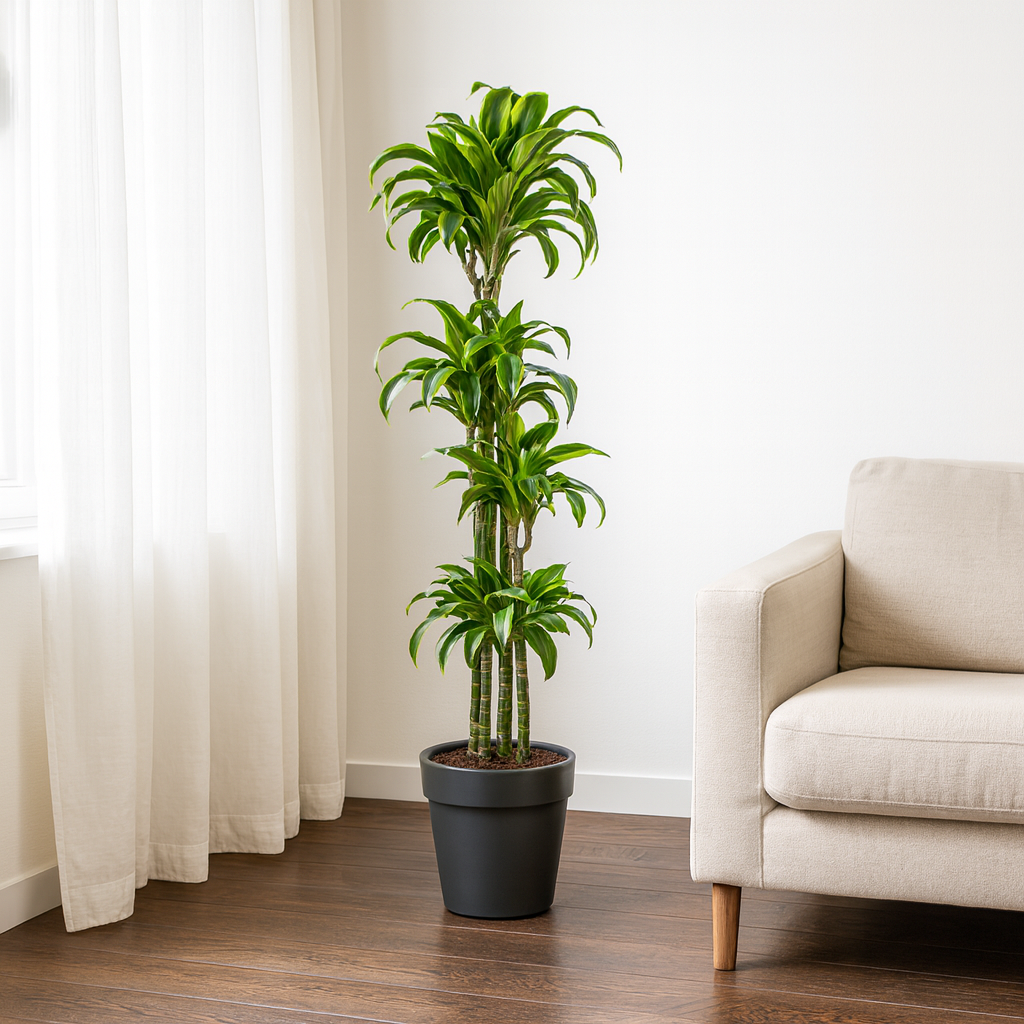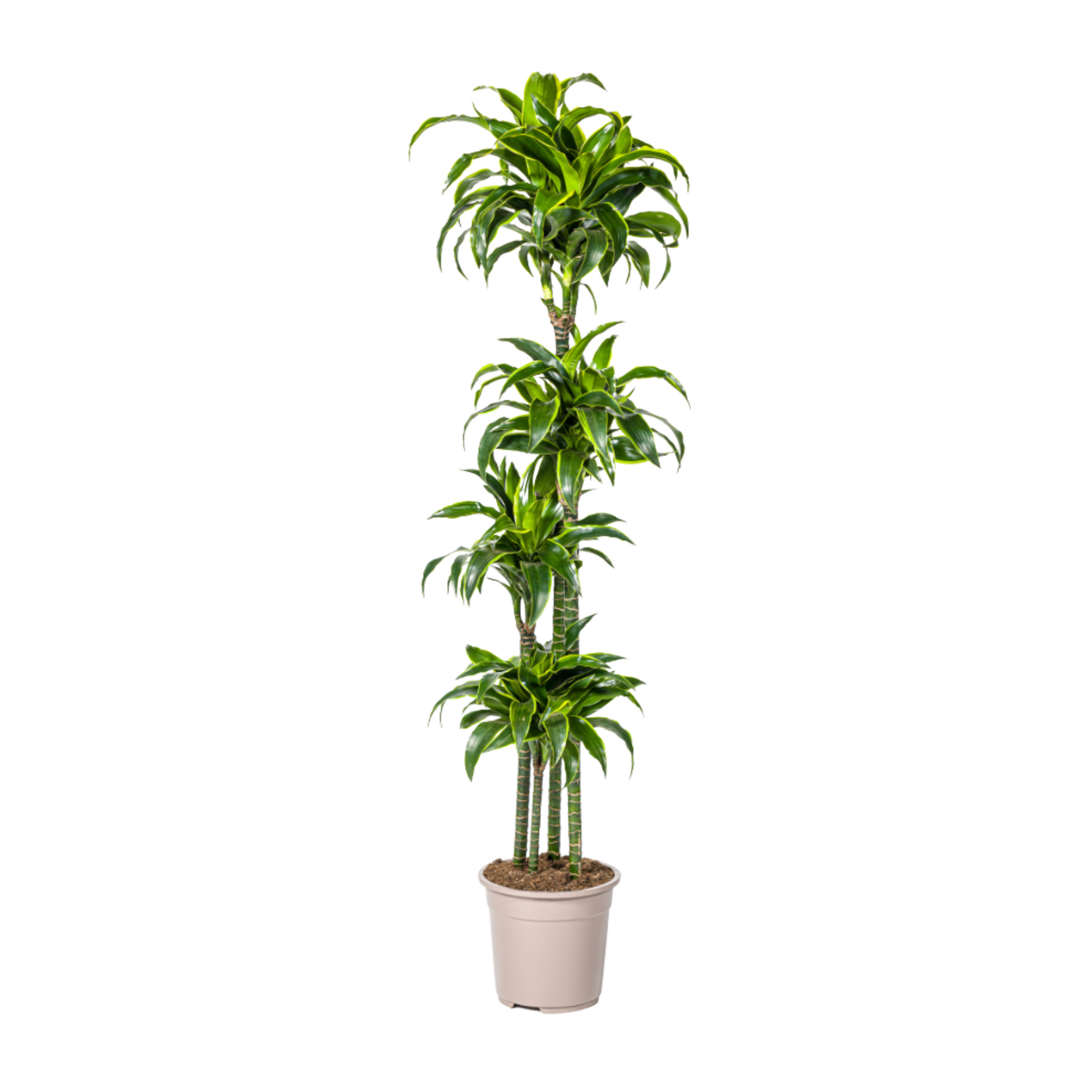 Die Dracaena Deremensis Dorado ist eine elegante Zimmerpflanze, die durch ihre glänzenden, dunkelgrünen Blätter mit leuchtend gelbem Rand einen luxuriösen Touch in jeden Raum bringt. Sie eignet sich ideal für Wohnräume und Büros.