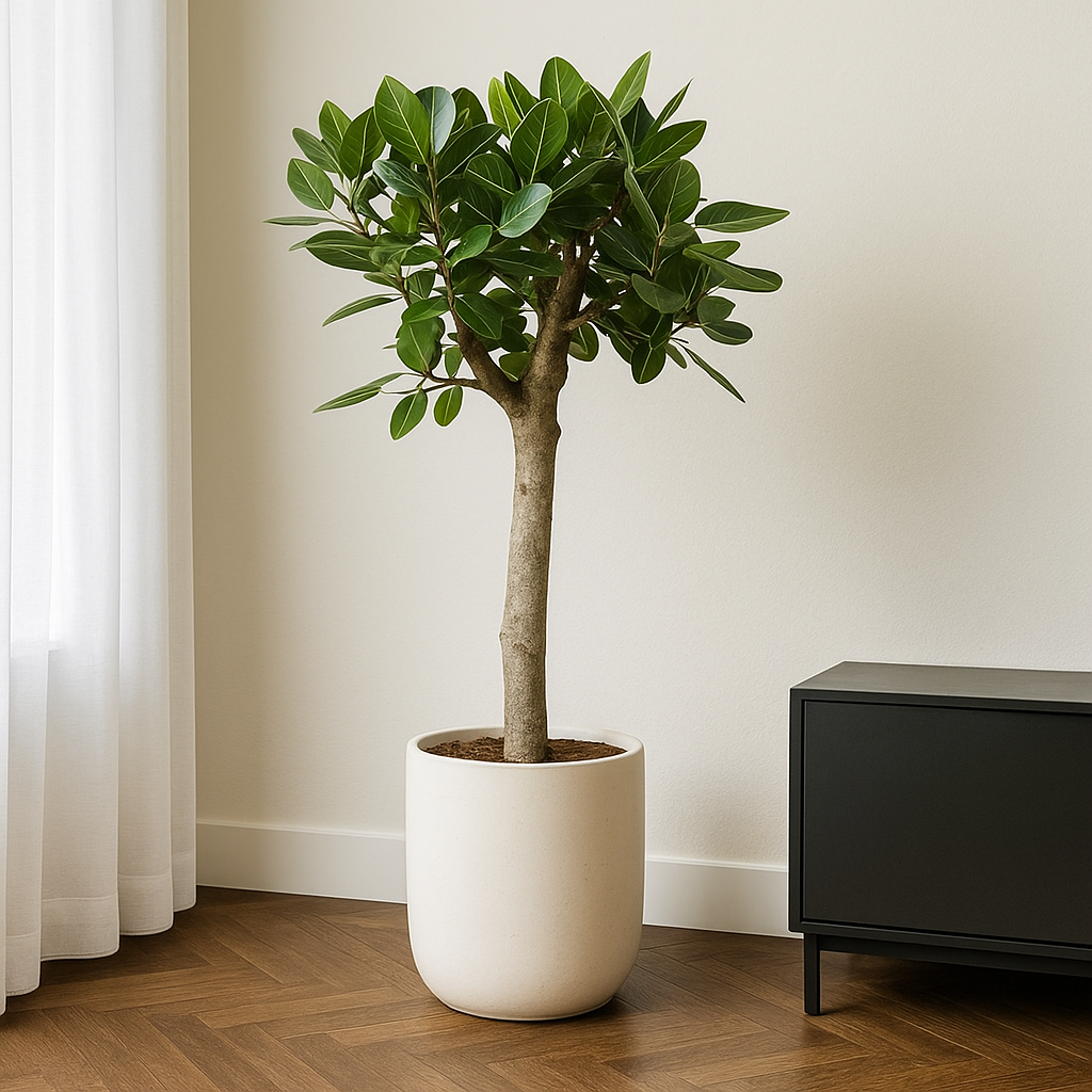 Die Zimmerpflanze Ficus Benghalensis, auch bekannt als "Banyan-Feige", bringt mit ihrer imposanten Blattkrone und exotischen Ausstrahlung tropisches Flair in dein Zuhause. Ihre aufrechte, baumartige Form macht sie zu einem echten Blickfang – ideal als markantes Element in modernen Wohnräumen oder Löwenstil-Interieurs. Aufgrund ihrer Herkunft aus den Tropen verlangt sie einen hellen Standort und gleichmäßige Pflege, bleibt dafür aber über viele Jahre dekorativ.
