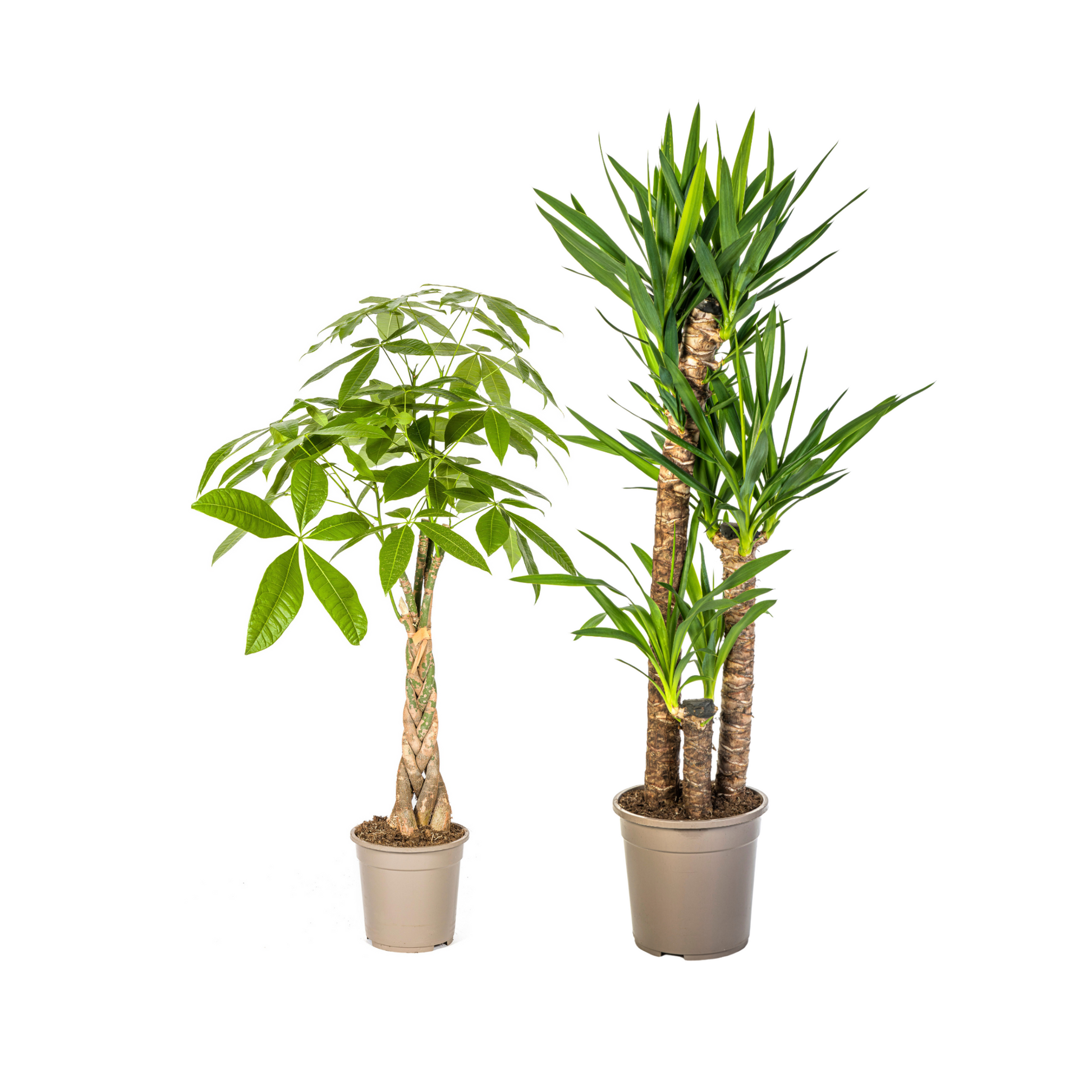 Dieses Pflanzenset ist die größere Version des Duo-Set's, bestehend aus der Pachira Aquatica "Glückskastanie" und der Yucca Elephantipes "Palmlilie". Dieses Set kombiniert Glück und Eleganz mit einem Hauch von tropischer Exotik. Beide Pflanzen sind robust, pflegeleicht und ideal für die Gestaltung moderner Wohnräume.
